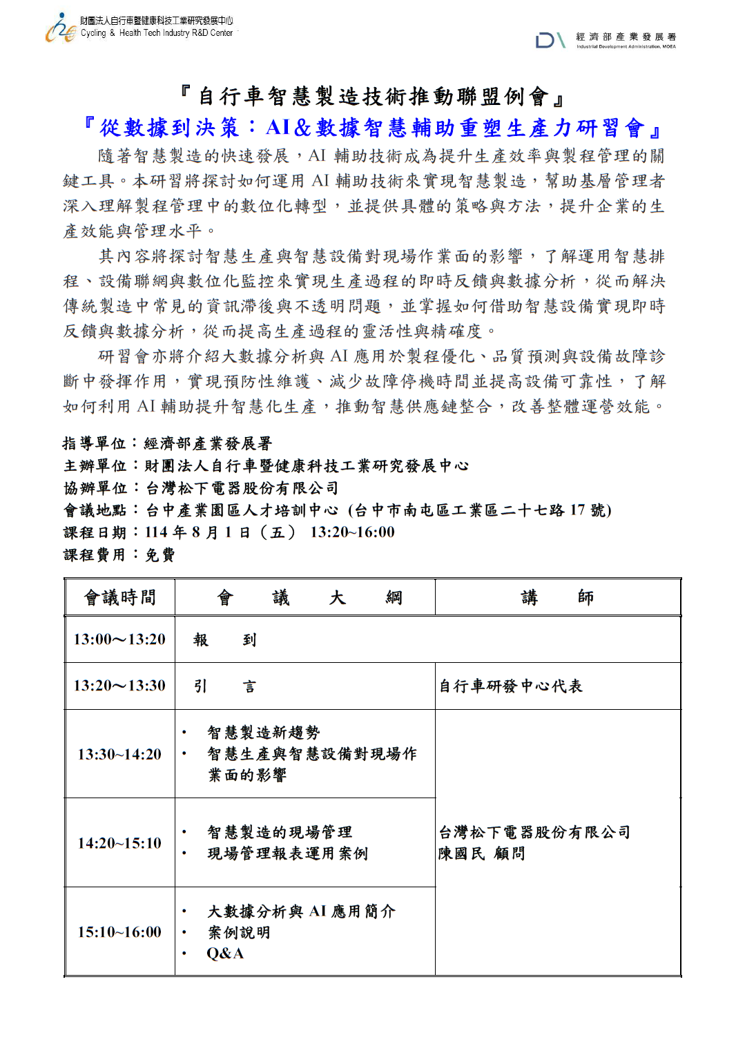 首頁 課程資訊 課程研討 114/08/01從數據到決策:AI&數據智慧輔助重塑生產力研習會 課程資訊 所有訊息 課程研討 2025-07-10 課程研討 114/08/01從數據到決策:AI&數據智慧輔助重塑生產力研習會 1 2026-04-30 114.08.01_研習會簡章 下載 BACK