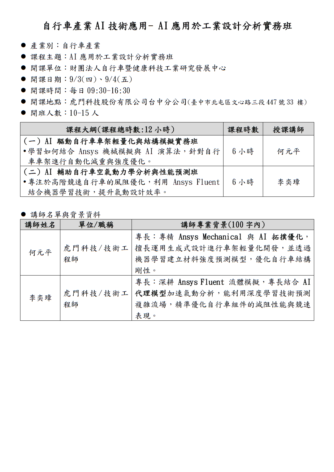 首頁 課程資訊 課程研討 115/09/03~04自行車產業AI技術應用- AI應用於工業設計分析實務班 課程資訊 所有訊息 課程研討 2026-03-20 課程研討 115/09/03~04自行車產業AI技術應用- AI應用於工業設計分析實務班 1 2026-04-17 115.09.03-04-AI應用於工業設計分析實務班-招生 下載 BACK