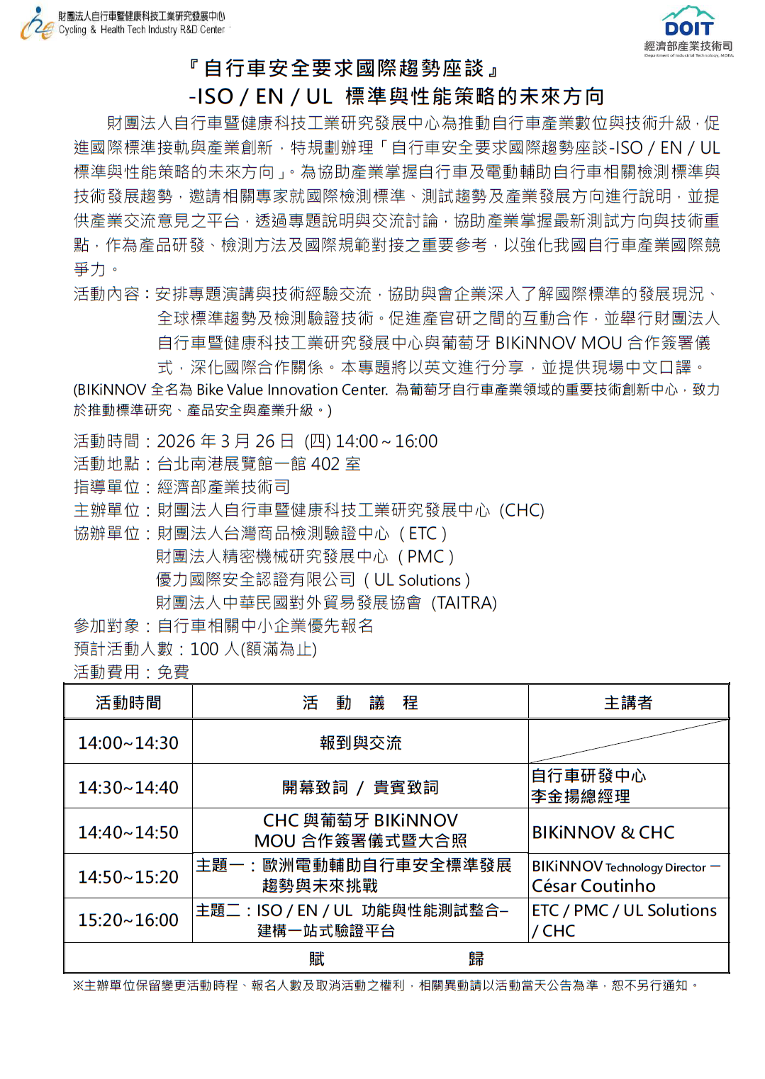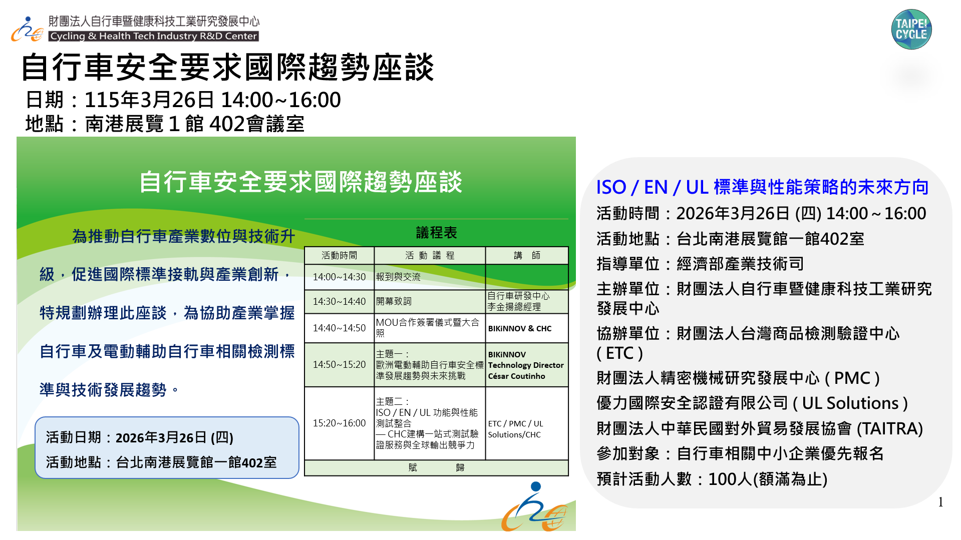 首頁 最新訊息 活動資訊 115.03.26(四) 檢測國際論壇活動資訊,歡迎業界踴躍報名 最新訊息 所有訊息 展覽資訊 產業研討 活動資訊 中心公告 2026-03-19 115.03.26(四) 檢測國際論壇活動資訊,歡迎業界踴躍報名 1 2026-04-25 115年台北國際自行車展-自行車安全要求國際趨勢座談v10- 下載 BACK