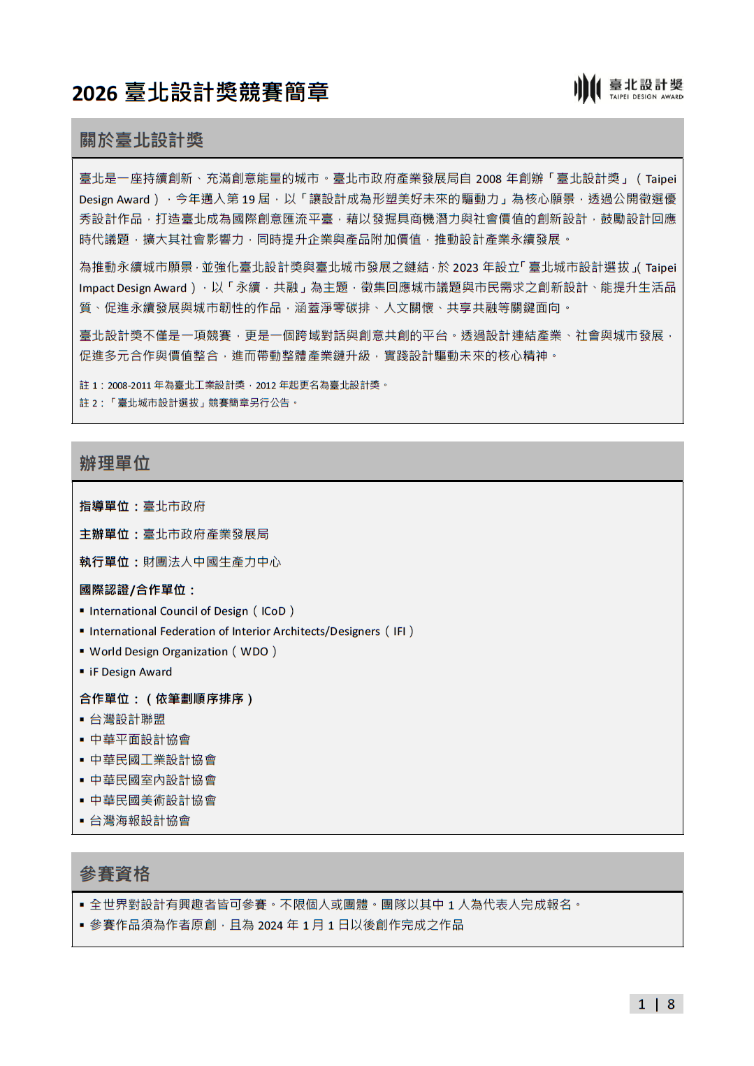 一、臺北設計獎係由臺北市政府產業發展局主辦之國際設計競賽,2026年(民國115年)已邁入第19屆,旨在發掘創新設計、促進產業發展,並提升國際設計領域之能見度;另「臺北城市設計選拔」聚焦永續與城市發展議題,鼓勵以設計回應城市問題,提升市民生活品質。