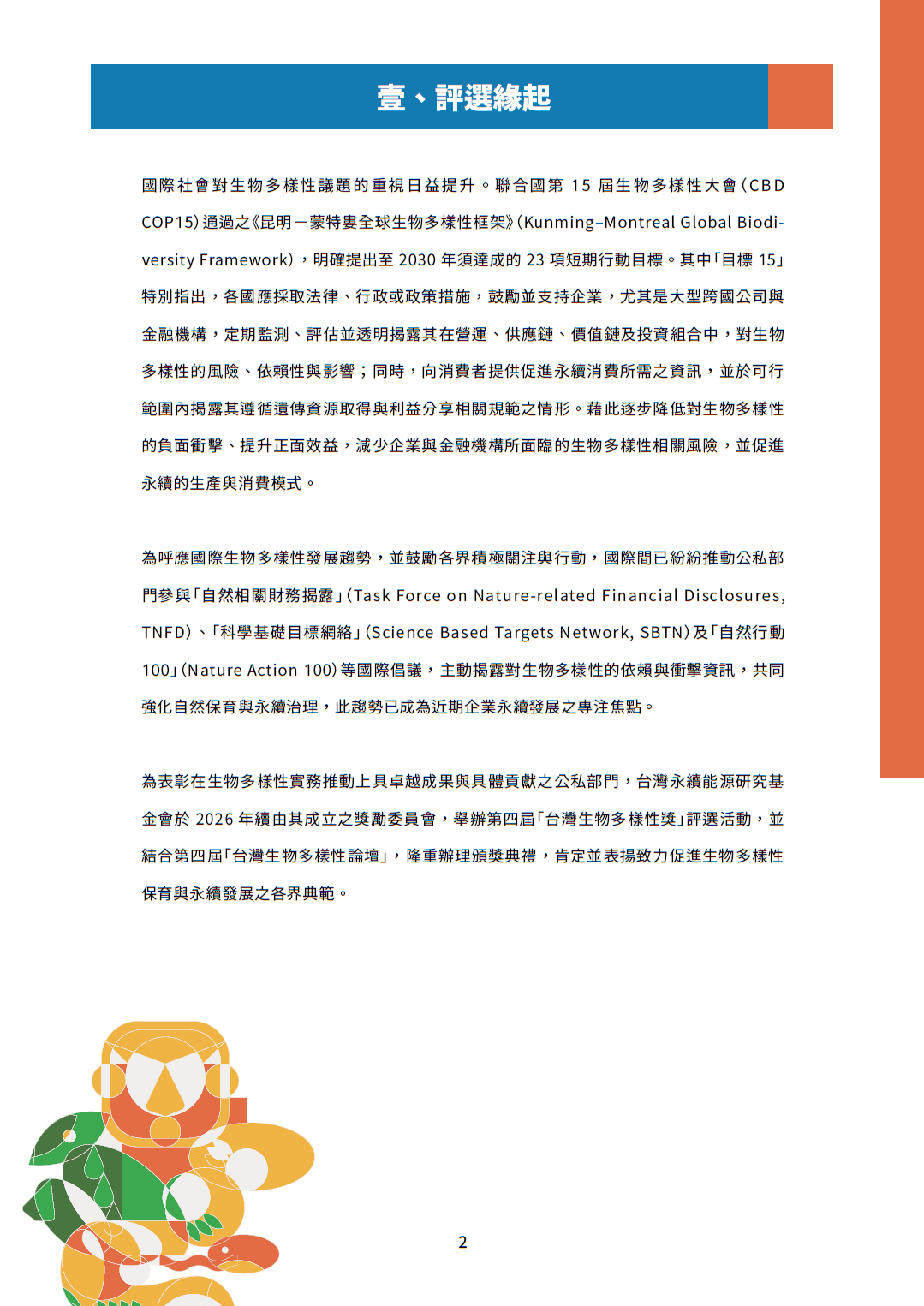 一、生物多樣性已成為全球永續發展核心指標,根據世界經濟論壇(WEF)最新《全球風險報告》,「生物多樣性喪失與生態系統崩潰」已列為未來十年之重大風險。為呼應國際趨勢並鼓勵企業接軌國際準則,本屆「2026 第四屆台灣生物多樣性獎」特別新增「自然相關財務揭露報告獎(TNFD Report Award)」,旨在表揚率先落實 TNFD 框架,並透明揭露自然相關依賴、衝擊、風險與機遇之優異單位,引領我國邁向「自然正向(Nature Positive)」之永續願景。