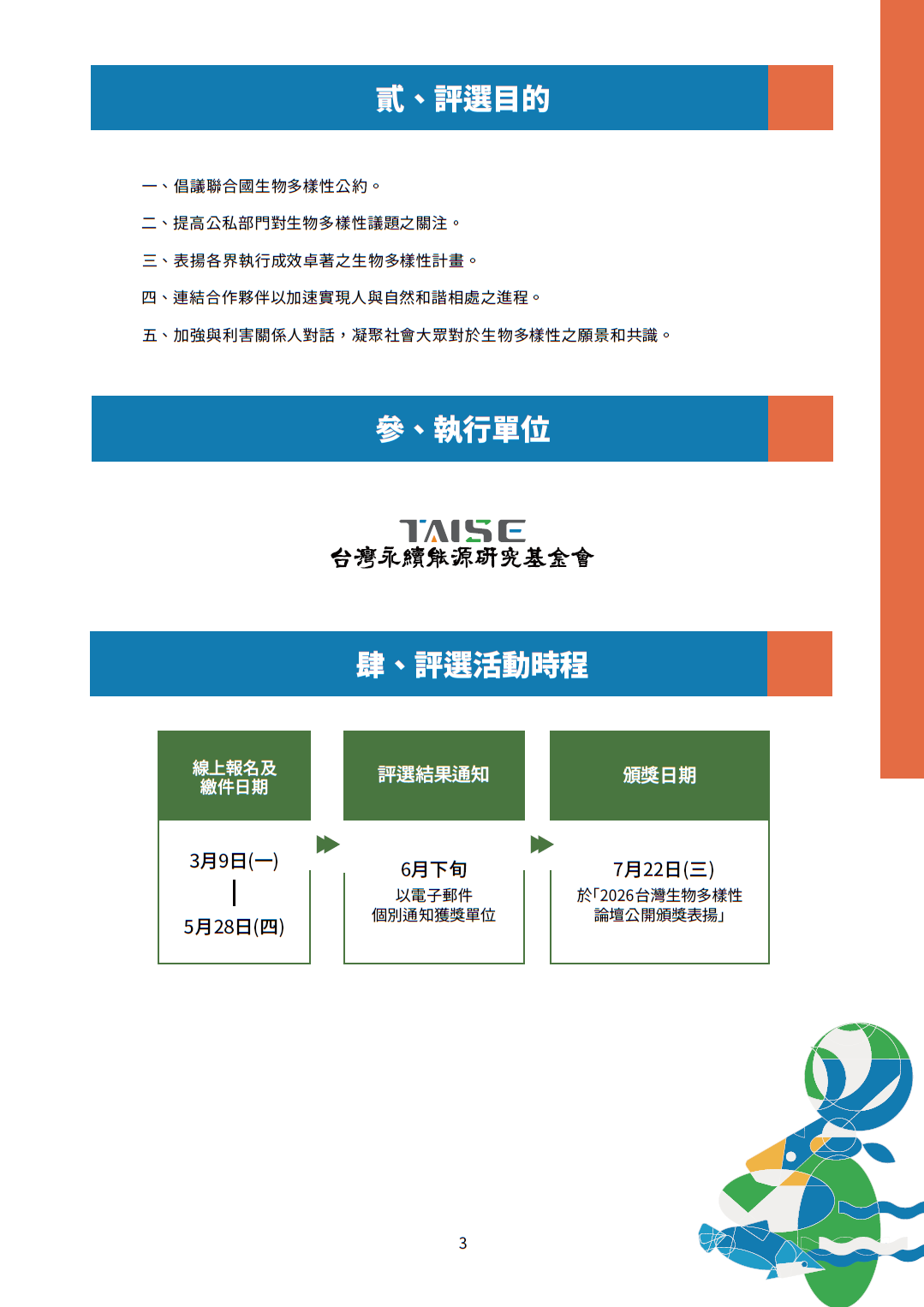 (一)頒獎典禮:預定於本(115)年 7 月 22 日(三)結合「第四屆台灣生物多樣性論壇」舉行。